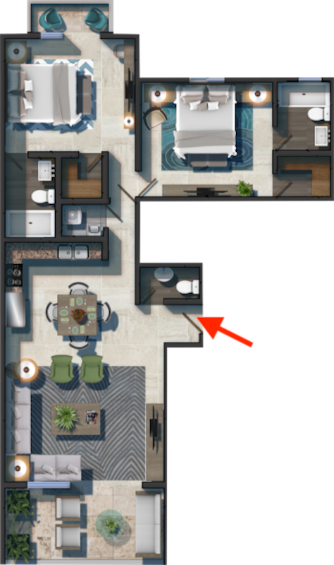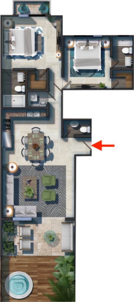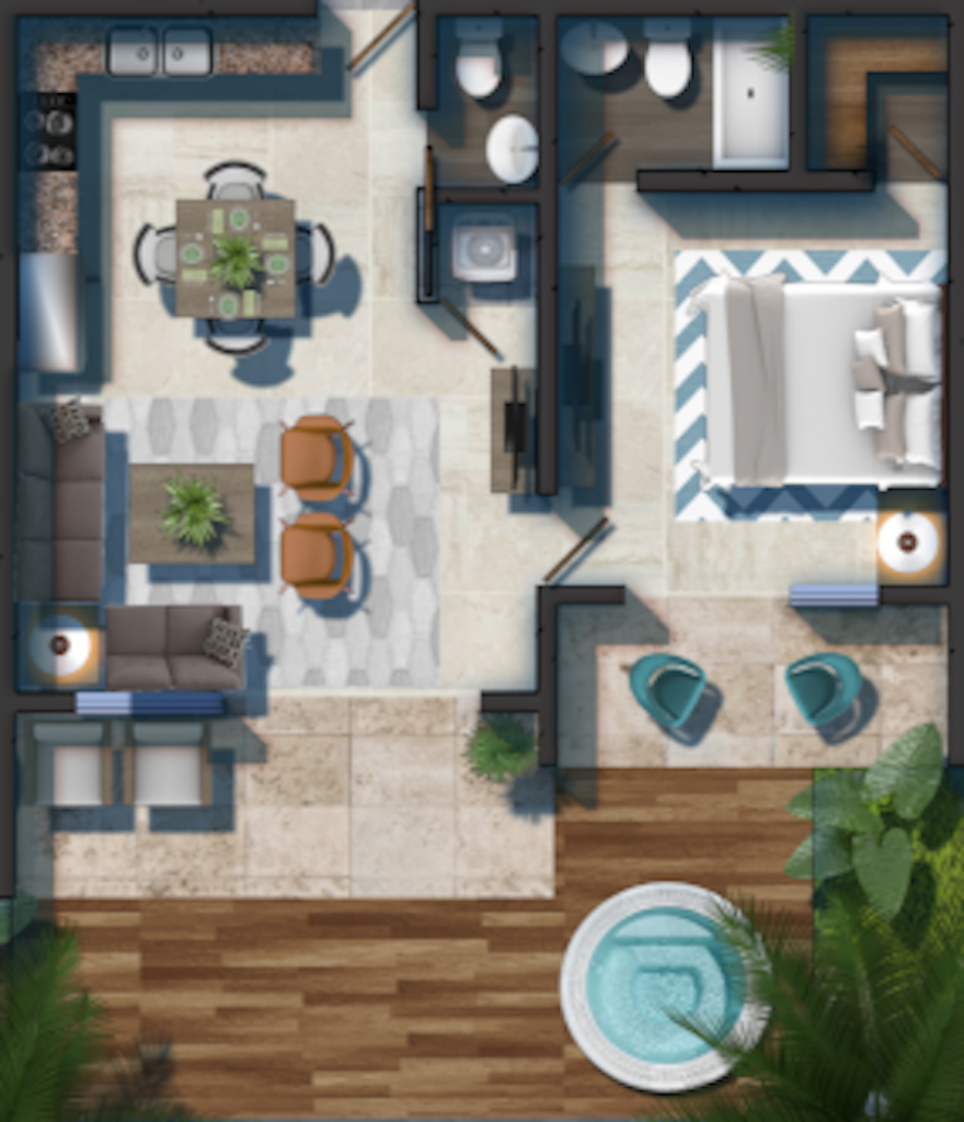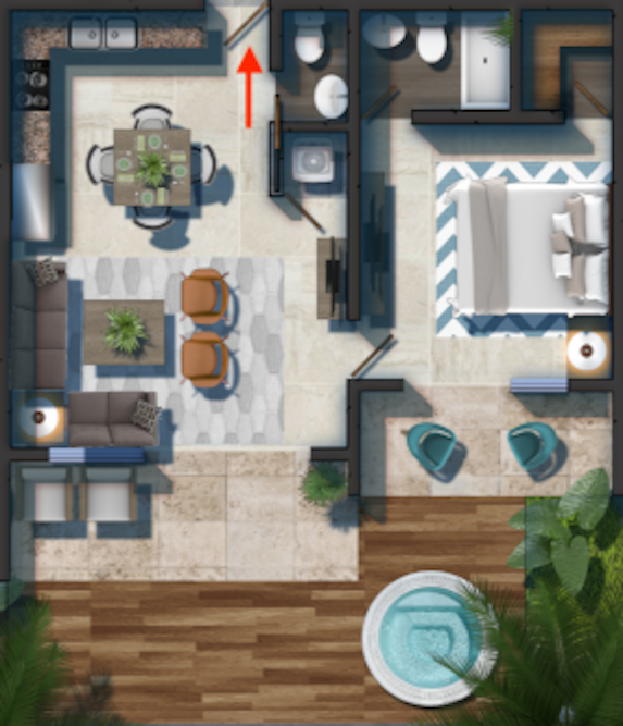 1 Bedroom with Walk-in Closet / 1 Full Bathroom / Guest Bathroom / Living Room / Dining Room / Kitchen / Laundry / Deck with Private Jacuzzi