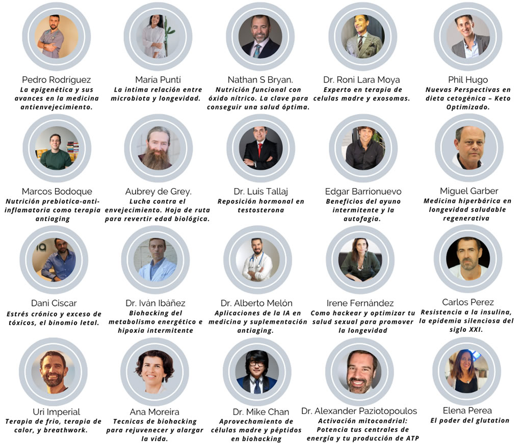 Asimismo, aplicaciones de la IA en medicina, suplementación antienvejecimiento, epigenética, ayuno intermitente, terapias de frío y calor, breathwork, salud sexual, estrés crónico y desintoxicación, regulación hormonal y testosterona, sueño, descanso y ritmos circadianos, óxido nítrico, metabolismo energético e hipoxia intermitente, fotobiomodulación, medicina hiperbárica, terapia con células madre, péptidos y análisis de longevidad.