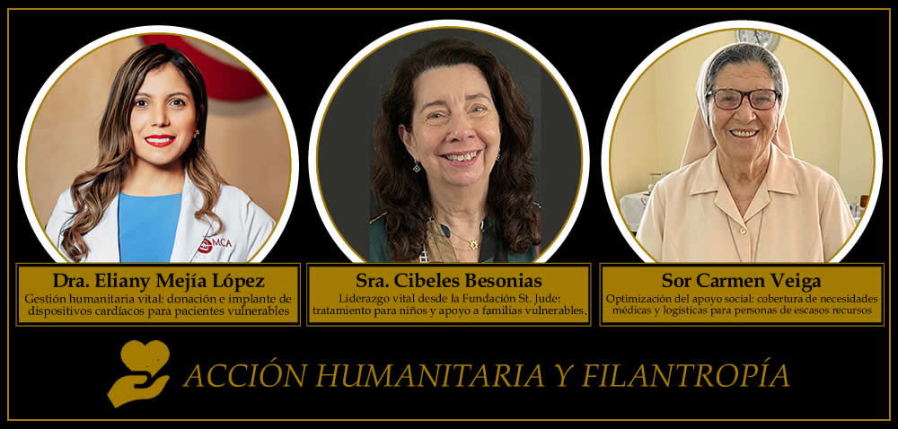 En Acciones Humanitarias y Filantropía fueron seleccionadas la Dra. Eliany Mejía López, de la Fundación Heart Care Dominicana, por el programa Regálame un Latido; la Sra. Cibeles Besonias, de la Fundación St. Jude República Dominicana, por la estrategia Cero Lista de Espera para niños con cáncer; y Sor Carmen Veiga, de la Red de Asistencia Humanitaria Pediátrica, por su labor en nutrición y apoyo a familias vulnerables.