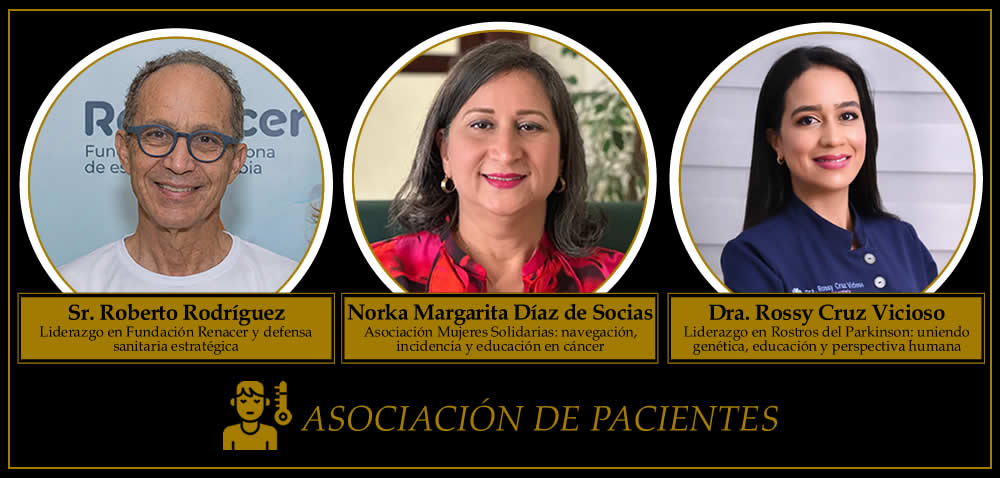 En la categoría Asociación de Pacientes fueron seleccionados Norka Margarita Díaz de Socias, por su liderazgo en la Asociación Mujeres Solidarias Incorporada (AMSI) en la atención integral del cáncer de mama; el Sr. Roberto Rodríguez, por la Fundación Renacer y su defensa del acceso a medicamentos para pacientes con esclerosis múltiple; y la Dra. Rossy Cruz Vicioso, por el proyecto Rostros del Parkinson de la Clínica Unión Médica, enfocado en educación, genética e investigación colaborativa.