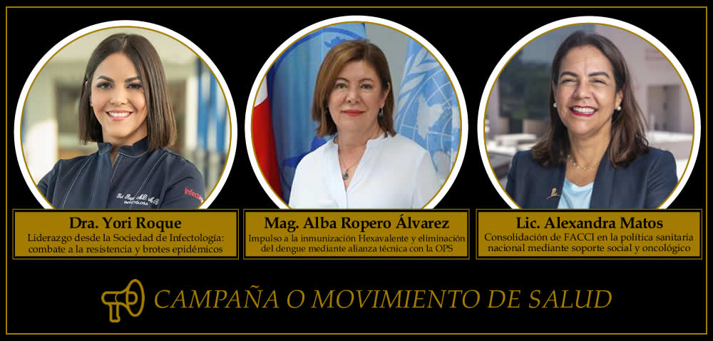 En Campaña / Movimiento de Salud los finalistas son la Dra. Yori Roque, de la Sociedad Dominicana de Infectología; Alba María Ropero Álvarez, de la Organización Panamericana de la Salud (OPS); y la Lic. Alexandra Matos, de FACCI, por liderar campañas de alto impacto en prevención, vacunación y cáncer infantil.