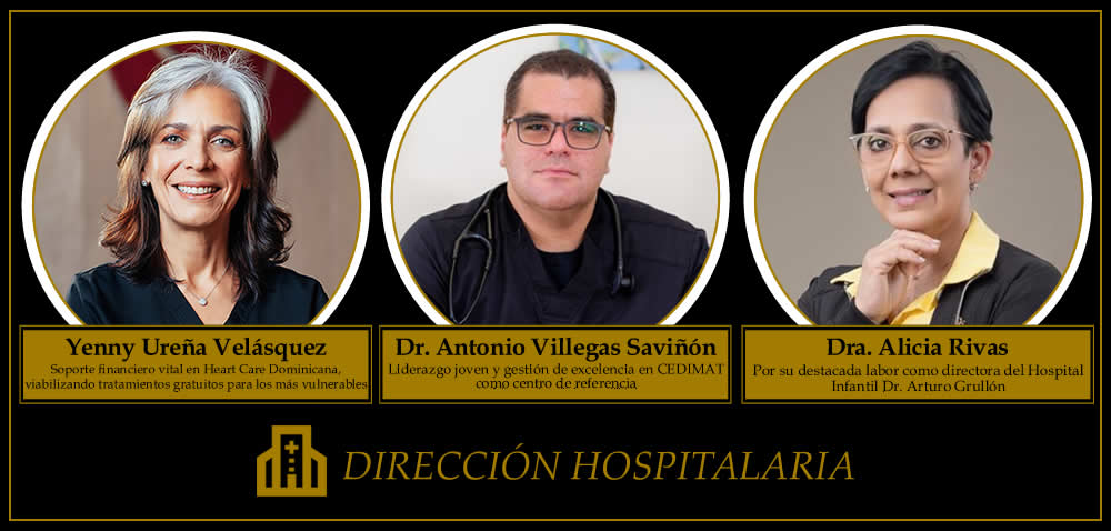 En Dirección Hospitalaria destacan Yenny Ureña Velázquez, de la Fundación Heart Care Dominicana; el Dr. Antonio Manuel Villegas Saviñón, de CEDIMAT; y la Dra. Alicia Rivas, del Hospital Infantil Dr. Arturo Grullón, por su liderazgo en la gestión de centros de alta complejidad.