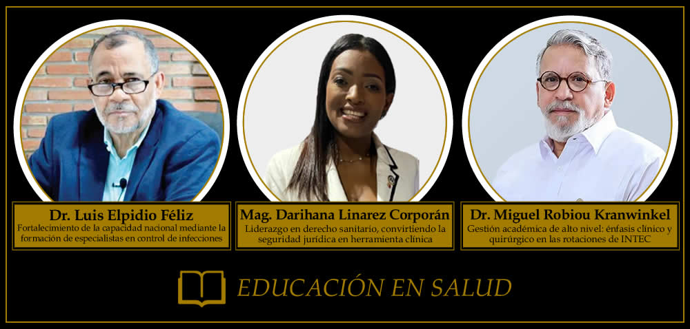En Educación en Salud fueron reconocidos el Dr. Luis Elpidio Féliz Féliz, de la Sociedad Dominicana de Epidemiología Hospitalaria; la Mag. Darihana Linarez Corporán, en Responsabilidad Médica; y el Dr. Miguel Robiou, de la Reacreditación Internacional CAAM-HP / INTEC, por su aporte a la formación continua del personal sanitario.