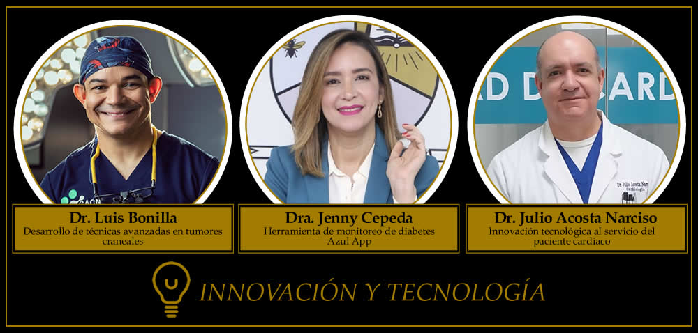 En la categoría Innovación y Tecnología destacan el Dr. Julio Acosta Narciso, de la Clínica Abreu; la Dra. Jenny Cepeda, de UNIBE; y el Dr. Luis Bonilla, de CEDIMAT / Hospital Gautier, por introducir soluciones tecnológicas de alto impacto clínico.