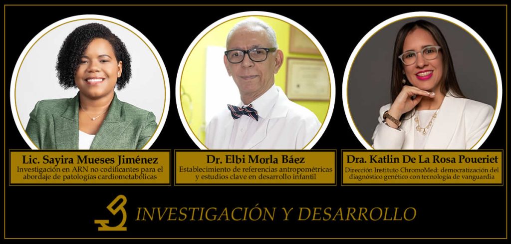 En la categoría Investigación y Desarrollo los finalistas son la Lic. Sayira Paola Mueses Jiménez, por su proyecto de Investigación Molecular y Medicina Traslacional; el Dr. Elbi Morla Báez, por las Referencias Antropométricas de la Niñez Dominicana; y la Dra. Katlin de la Rosa Poueriet, del Instituto de Genética ChromoMed.