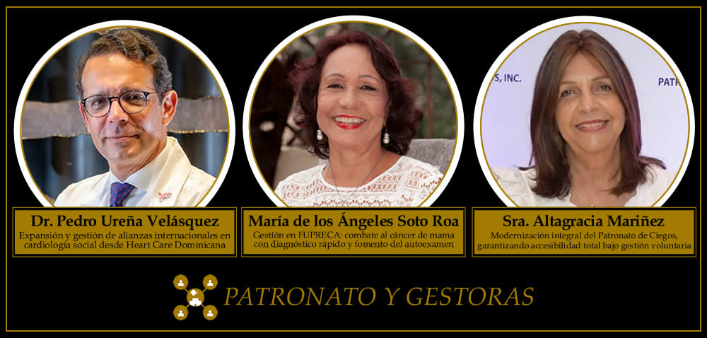 En la categoría Patronatos y Gestoras fueron seleccionados el Dr. Pedro Ureña Velásquez, de la Fundación Heart Care Dominicana; María de los Ángeles Soto Roa, de FUPRECA; y la Sra. Altagracia Mariñez, del Patronato Nacional de Ciegos, por su impacto en la prevención, rehabilitación y acceso a servicios.