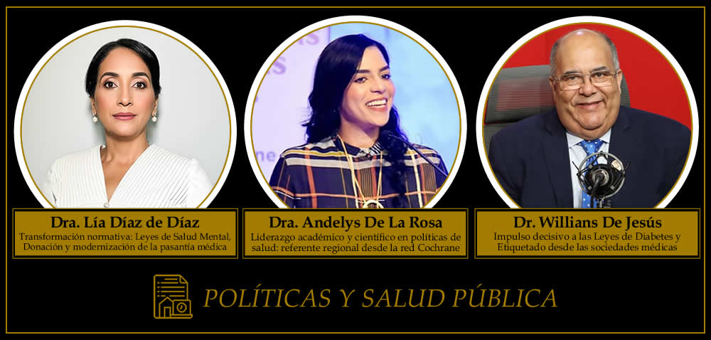En Políticas y Salud Pública los finalistas son la Dra. Andelys Virginia de la Rosa Toribio, del Ministerio de Salud Pública y Cochrane RD; el Dr. Willians de Jesús, de SODENN; y la Dra. Lía Díaz de Díaz, del Senado de la República, por su liderazgo en reformas, leyes y políticas públicas basadas en evidencia.