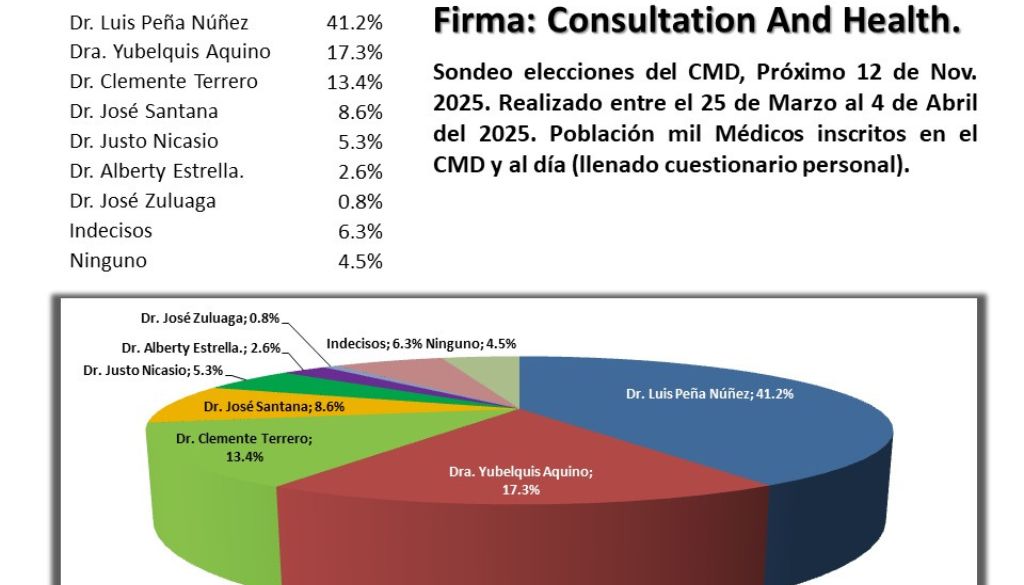 Un reciente sondeo realizado por la firma «Consultation And Health» revela las preferencias de los médicos inscritos en el Colegio Médico Dominicano (CMD) de cara a las elecciones del próximo 12 de noviembre de 2025.