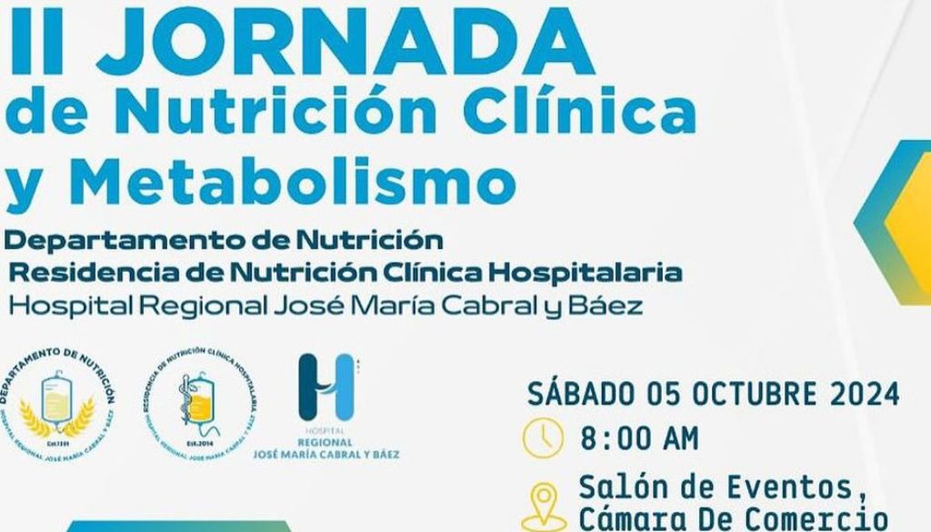 El departamento de nutrición y la residencia de nutrición clínica hospitalaria del Hospital Regional Universitario José María Cabral y Báez realizará la II jornada de nutrición y metabólica. Esta actividad se llevará a cabo el 05 octubre a las 8:00 a.m., en el salón de eventos Cámara de Comercio. Esta jornada cuenta con el aval […]
