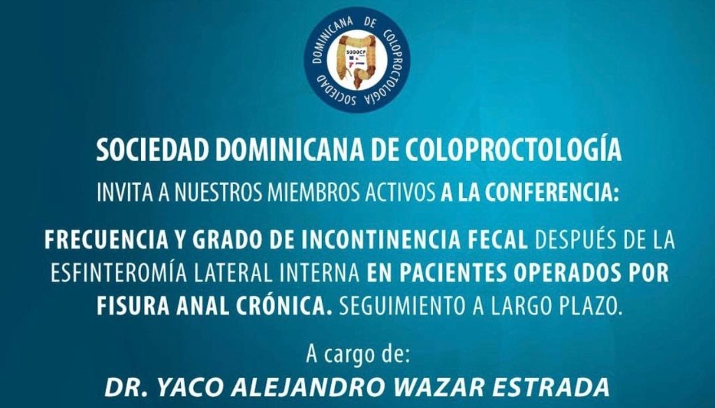 La Sociedad Dominicana de Coloproctología invita a sus miembros activos a participar en la conferencia “Frecuencia y grado de incontinencia fecal después de la esfinterotomía lateral interna en pacientes operados por fisura anal crónica. Seguimiento a largo plazo”. Esta ponencia estará a cargo del doctor Yaco Alejandro Wazar Estrada. La actividad se realizará de manera […]